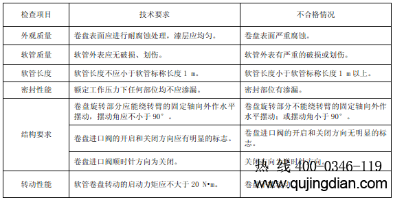 6.8.5.2.1 目測檢查消防軟管卷盤外觀質(zhì)量、軟管質(zhì)量和結(jié)構(gòu)要求,用鋼卷尺測軟管長度,用直角尺測卷盤擺動角。